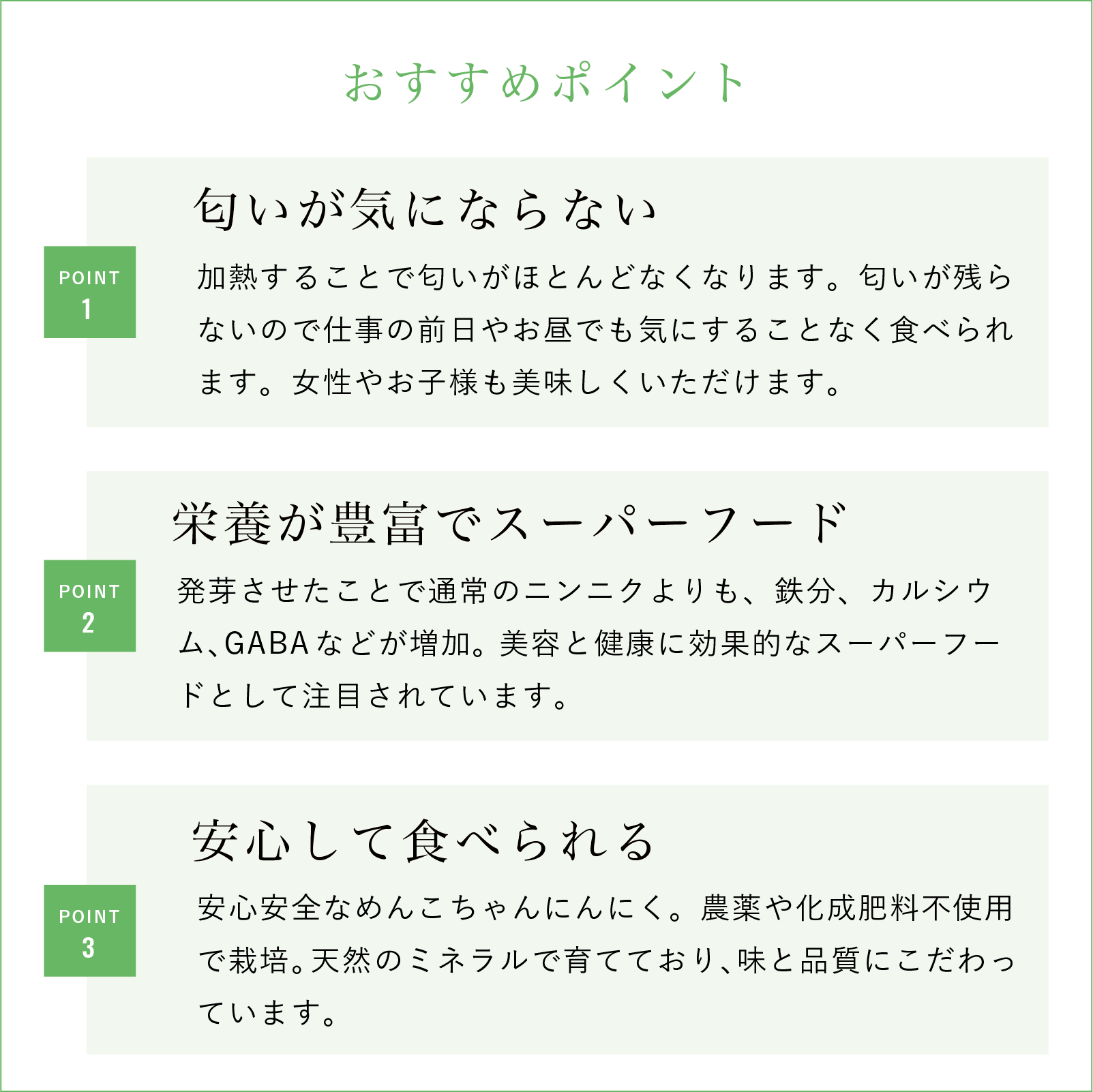 おひたしから唐揚げまで調理もしやすく、にんにく特有のにおいが残りにくいという革命。ぜひ一度お試しあれ!